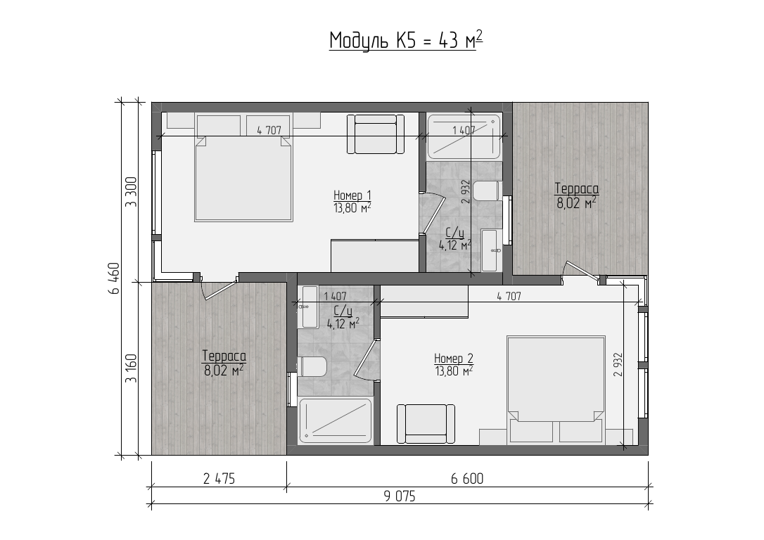 Удобный вариант для гостиничного бизнеса. Здесь есть всё, что необходимо для комфорта: 2 спальни, санузел и 2 небольшие террасы.